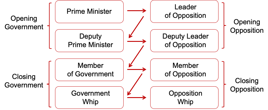 The teams supporting the motion are known as the Government teams, while the teams opposing the motion are the Opposition. The two teams speaking first on each side are known as the Opening teams, while the two teams speaking second on each side are known as the Closing teams. The sequence of the debate is illustrated below: